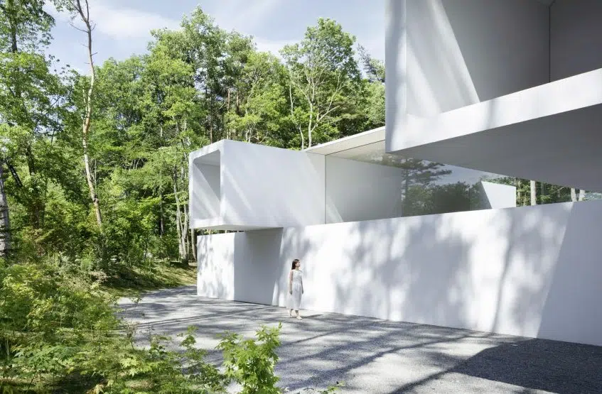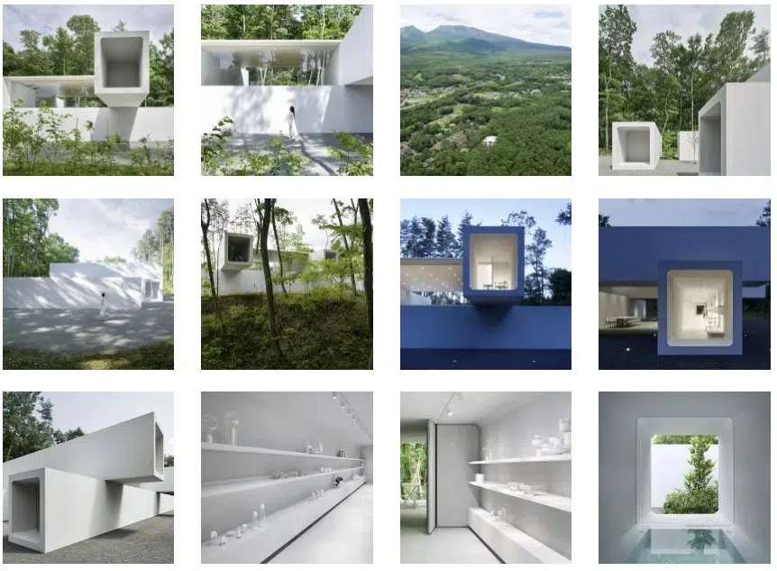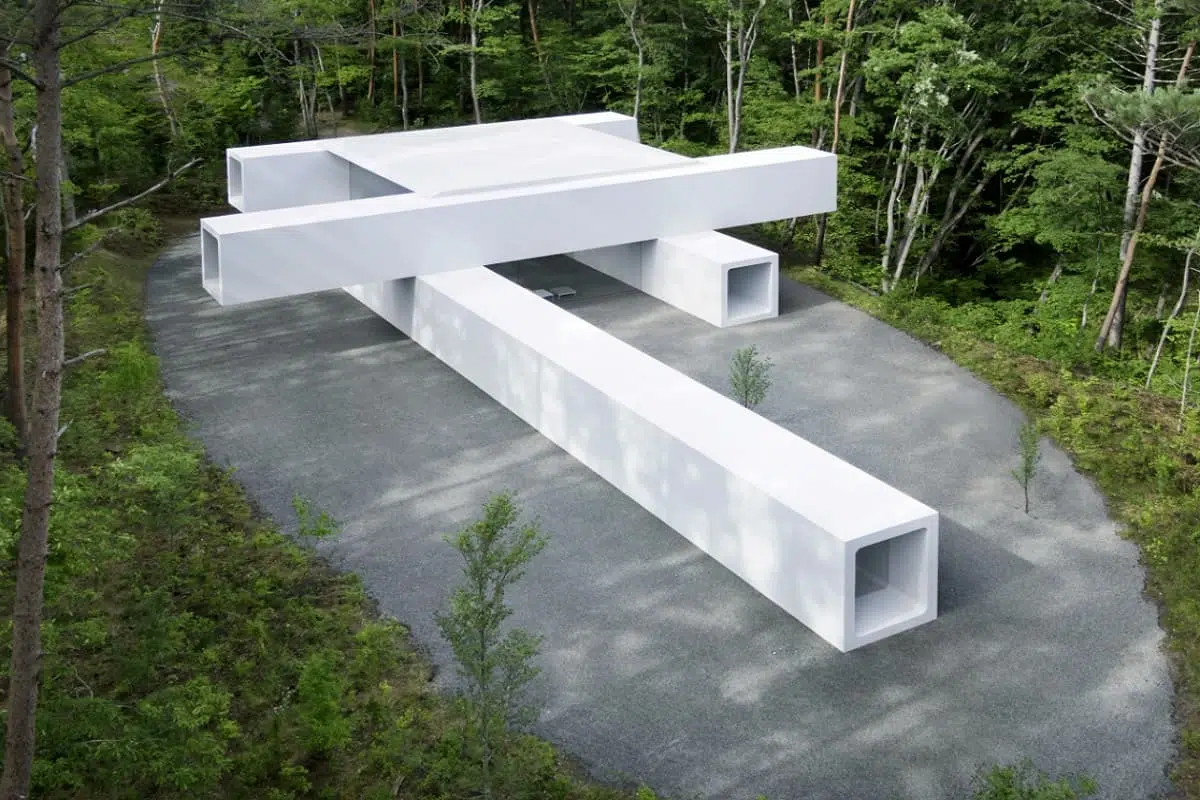 El singular edificio está situado entre los densos bosques de las afueras de la ciudad de Miyota, en Japón. En un entorno tranquilo y rico en naturaleza donde los arroyos se entrelazan a través de un espeso bosque de pinos rojos.